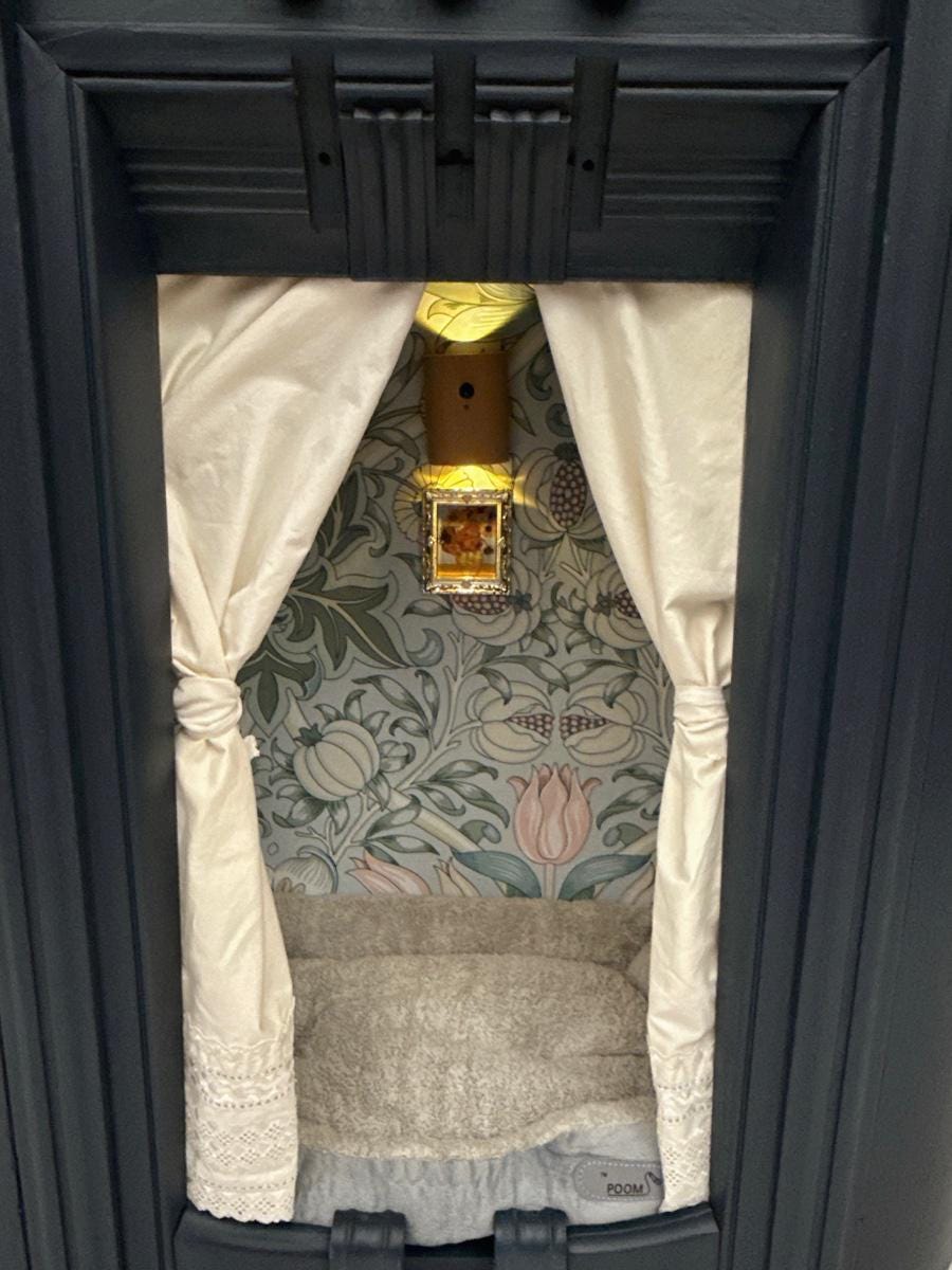 The pet bed is a blue beauty, made from a 1936 Philco Model 650 radio. It's complete with latticed curtains, a. motion sensor light and framed art work, in addition to the blue paint and complimentary wallpaper. Measurements: 24" L x 11" W x 38" H