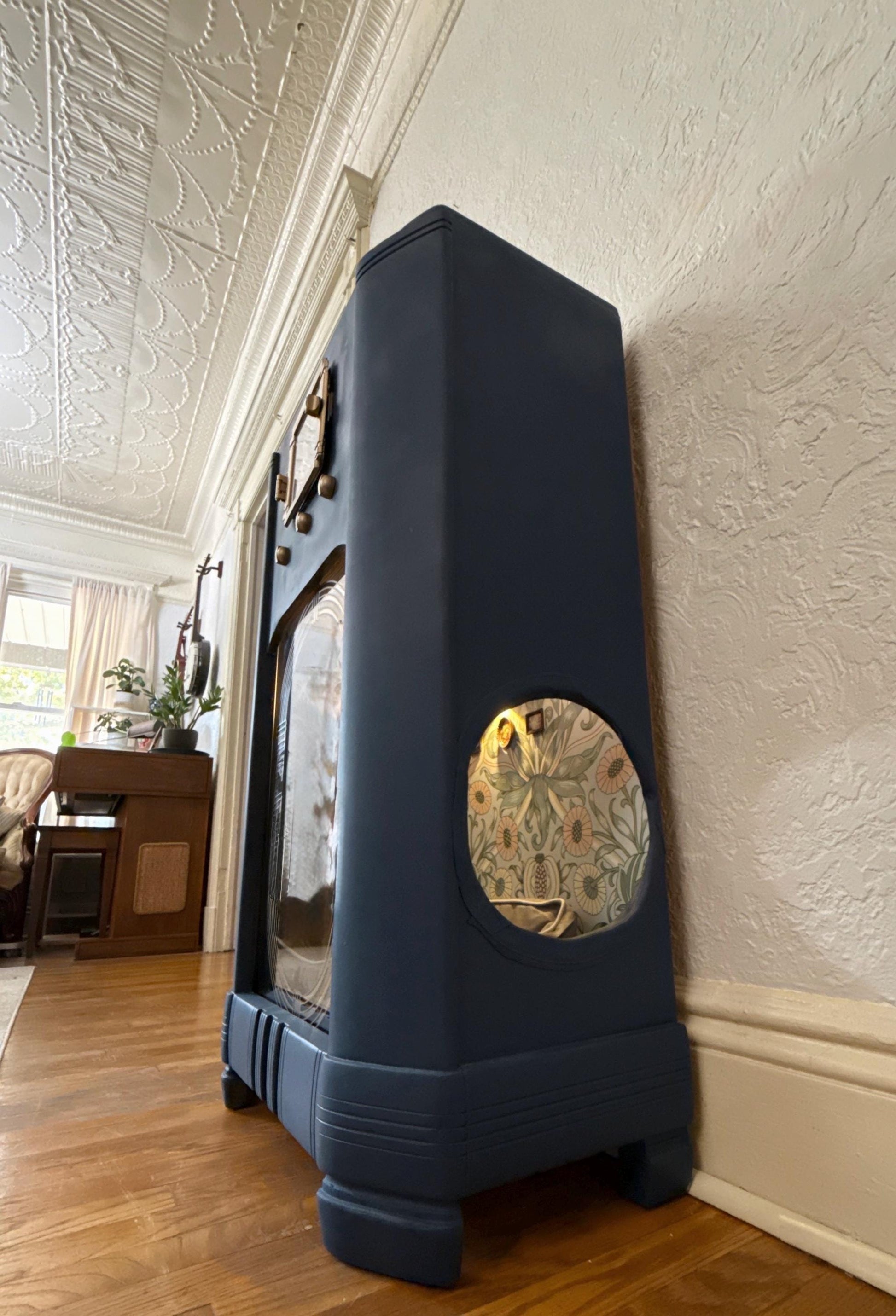 This is a one-of-a-kind cat bed with refurbished and upcycled from a 1930s era Philco radio. This item is real wood that's been sanded, stripped, repaired and painted a beautiful blue. The item has a side entrance, plush bed, reclaimed art deco glass, a drawer made from the art deco radio dial, art work, motion sensor lights and beautiful wallpaper. Imagine if that unique accent piece was also a cozy nook for your pet.
